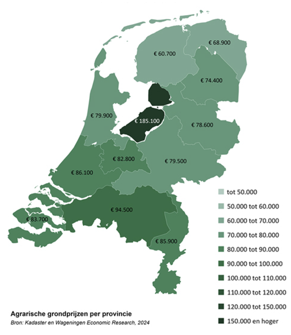 De agrarische grondprijs stijgt al vele jaren. Tussen het eerste kwartaal van 2021 en het eerste kwartaal van 2024 zette de stijging door, met een toename van ongeveer € 68.000,- per hectare naar € 79.000,- per hectare. Dit is een stijging van ongeveer 16 procent. De agrarische grondprijzen in Nederland lopen ook sterk uiteen (zie figuur 1). In Friesland is de gemiddelde grondprijs € 60.800,- per hectare terwijl deze in Flevoland € 182.700,- is. Deze verschillen hebben onder andere te maken met de kwaliteit van de grond (bouwland is bijvoorbeeld meer waard dan grasland), de mogelijkheden voor alternatieve inkomsten (zoals opbrengsten uit wind- en zonne-energie) en de druk op de grondmarkt vanuit stedelijke functies.